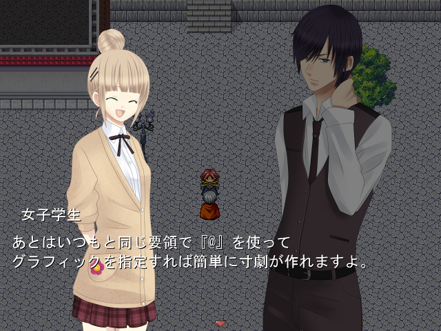 【ファイル】[1] 寸劇コモン [ sungeki.zip: 406.14KB ] 【説明】 【1】 sin 文章表示の@を使ってテイ●ズ風な寸劇を作成するコモンです。 立ち絵を使った会話を作りたい時なんかにどうぞ。 少しややこしいのでreadmeをよく読んだ上でお使い下さい。 このコモンは 使用報告や著作権表記などは特に必要ありません。 【一言】 (→コメントを書き込む) [10/14 15:28] haruちゃん お借りします! [07/25 19:54] マカロン 使います! |
