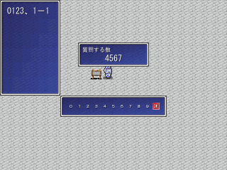 【ファイル】[1] コモン本体 [ np1.common: 9.35KB ] [2] サンプルゲーム [ np1Data.zip: 147.31KB ] 【説明】 【1】 しゅす ゲームが設定した4つの数字を質問によって当てるゲームです。 イベントで呼び出してください。 設定する数字の桁数を選べるようになりました。 【一言】 (→コメントを書き込む) |