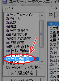 | 【2】 編集するタイプの選択 ウィンドウが開いた直後は「タイプ」が「技能」になっています。 今回の設定はユーザデータベースの12番「┗ 状態耐性」で行いますので、 「12:┗ 状態耐性」をクリックして下さい。 |