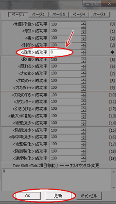 | 【4】 属性への耐性 次に、状態異常が通用する確率を設定します。 今回は「麻痺」状態への耐性を強くしますので、 ウィンドウ右端にある「<麻痺>成功率」を編集します。 ページ1の一番上から5つ目にある項目です。 入力欄に「0」(全く効かない)を入力してください。 選択できたらウィンドウ右下のボタン「OK」か「更新」を押して上書きします。 |