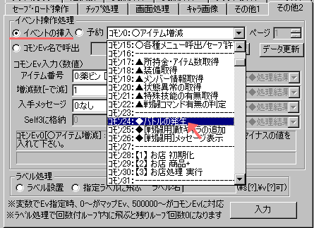 | 【3】 「イベントコマンドの挿入」ウィンドウが 出てくるので、上部タブにある 「その他2」を選択して下さい。 |