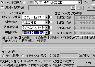 | 【5】 次に、「コモンEv入力(数値)」の欄を、 以下のように設定します。 ・出現させたい敵グループ [1:ゴブリン3体] ・逃走可能に「0:逃走可能」 ・敗北時処理処理 「0:ゲームオーバーEv」 ※[0:ゲームオーバー処理 / 1:イベント続行] の2つがありますが、ここでは負けると ゲームオーバーイベントが起きるようにします。 ・BGMに「3:戦闘BGM」 設定したら「入力」をクリックしてください。 |