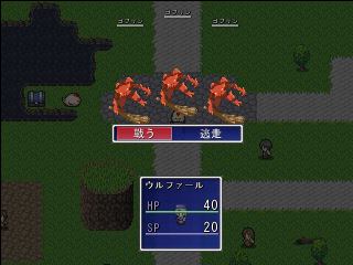 | 【8】 テストプレイを開始し、 ニワトリに向かって決定キーを押すと、 無事、ゴブリン3体と戦闘になりました! これで、話しかけるたびに 何度でもこの戦闘が発生する、 シンプルな戦闘イベントが完成しました。 おつかれさまです。 |