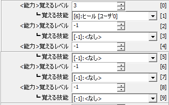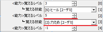| 【4】 上から2つ目の「<能力>覚えるレベル」を5に、 その1つ下の「┗覚える技能」を「[2]:力ため」 に設定します。 ※一番上には既にレベル3で「ヒール」を覚えるように設定がされているので、 これは残しておきます。 |
