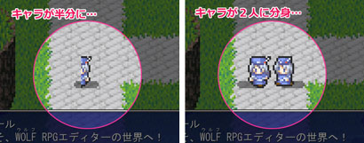 【余談1】 詳しい説明 ウディタはキャラクターの画像(キャラチップという)の規格について、 「4方向対応」と「8方向対応」、の二つの方式から選ぶことができます。 「4方向対応」とは、上・下・左・右の4方向を向いた絵が用意されている画像で、 「8方向対応」とは、4方向に加え、右上・右下・左上・左下を向いた絵が用意されている画像です。 ![]() ツクール規格のキャラチップ(First Seed Material様方の素材など)は 「4方向対応」のキャラチップです。上下左右の4方向を向いた絵しかありません。 残念なことに「8方向対応」のキャラチップ素材は、ネット上にあまり多く出回っていません。 さて、半分に表示されたり、分身が表示される原因についてですが… ウディタはキャラを表示する際、1つの画像を分割して表示しているのはお分かりだと思います。 その時の分割数は、素材のサイズごとに決まるのではなく、 「画像の方向タイプ」と「アニメパターン」の設定によって決まっています。 ウディタ側の設定が「4方向対応」だと、画像を横方向に3分割します。 「8方向対応」だと、倍の6分割です。(※いずれもアニメパターンが3パターンの場合) 「4方向対応」のグラフィックは本来ならば3分割されるべきなのですが、 設定が「8方向対応」になっているので、6分割されてしまい、 本来表示されるべき画像の半分が表示されてしまったのです。 2キャラに分身する場合も同様で、6分割して表示されるべき画像が、 3分割で表示されるために、2キャラが表示されてしまっていた、というわけでした。 (※ 3分割、6分割と書きましたが、アニメパターンが5パターンの場合は5分割10分割になります。) なお、「4方向対応」と「8方向対応」の画像を一つのゲームで両方とも使うことはできません。 どちらかに統一するようにしましょう。 |