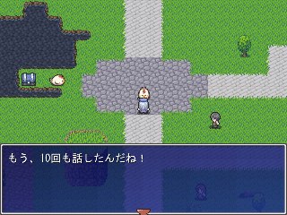 【4】 ◆新しいイベントを作ってみたいの 【7】〜【10】の手順をまねて、 「話すのは、\self[0]回目だね!」と入力します。 \self[0]は特殊文字のひとつで、 「このイベントのセルフ変数0に入っている数」を 表します。ここまでで、○回話しかけると 「話すのは、○回目だね!」としゃべるイベントが できました。次に、10回以上話すと会話内容が 変わるようにします。 |