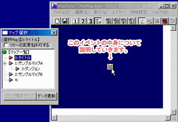 | 【2】 イベントを開く マップ選択 「0:タイトル」をクリックし、 タイトルマップを開きます。 まん中に一つだけある イベントを右クリックし、 「イベントの作成/編集」 をクリックして下さい。 |