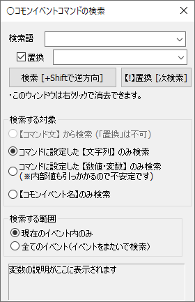 【検索語】 検索したい文字列を代入してください。 「【数値・変数】のみ検索」時には数値入力ボックスが表示されます。 Shiftを押しながら検索ボタンを押す(またはShift+Enterを押す)と、 逆方向へ検索します。 【置換】 文字列や数値を置換する場合にチェックをオンにし、 置換後の文字列を代入してください。 【検索する対象】 ・【コマンド文】から検索 コマンドリストに表示されているコマンド文を対象に検索します。 ・コマンドに設定した【数値・変数】のみ検索 コマンドに設定された数値・変数を対象に検索します。 変数を検索したい場合は、変数呼び出し値を入力してください。 ・コマンドに設定した【文字列】のみ検索 コマンドに設定された文字列を対象に検索します。 文字列ピクチャに設定した文章などは、コマンド文では 切れてしまいますが、この検索方法なら内部の 文字列全文を正しく検索することができます。 ・【コモンイベント名】のみ検索 コモンイベントの名前だけを対象に検索します。 【検索する範囲】 ・現在のイベント内のみ … 今開いているイベント内だけ検索します。 ・全てのイベント … 見つからない場合、次々にイベントをまたいで検索します。 |