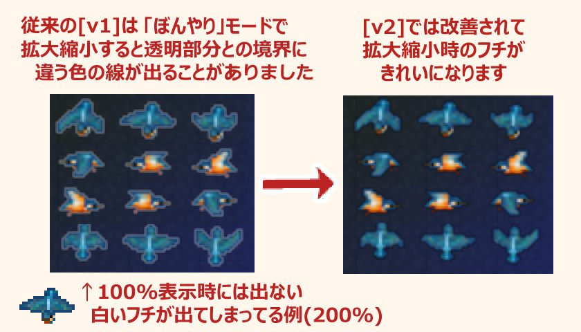 | ●画像拡大縮小時の外ぶち / [乗算]描画 の挙動 (Ver3.670より) 「v2:外ぶちキレイ / [乗算]時半透明部分が暗めに」と 「v1:外ぶち変 / [乗算]普通 / 変換エフェクトにバグ有」から選択可能です。 「画像拡大縮小時の外ぶち」とは以下のような差です。基本的には「v2」のほうがふちが自然になります。 ![]() ただし、v2にするとピクチャなどで[乗算]描画したとき、「半透明部分が暗めに表示される」という補正がかかります。 「半透明なしの画像」や「JPGファイル」ならv1、v2でどちらも同じ挙動になりますが、 半透明の画像の[乗算]だけ挙動の変化が出ますので、 もし昔の挙動のままにしたい場合は「v1」にしてください。 一方、v1だとピクチャに「変換」エフェクトをかけた際、「半透明部分の色が変になる」というバグが発生します。 これを修正する目的でv2処理が作られており、すべてを完璧にすることはできません。 v1もv2も一長一短ですが、最初から開発できる方は「v2」に合わせて作られる方が総合的にはお得だと思います。 |
