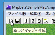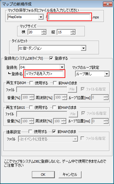 【マップの保存フォルダとファイル名】 保存したいフォルダを左のプルダウンメニューから選び、 保存したいファイル名を右の文字入力欄に入力します。 【マップサイズ】 マップの大きさを指定します。単位はチップ数です。 【タイルセット】 マップの描画に使用するタイルセットを選択します。 【登録先】 マップファイル(mpsファイル)は通常、システムDBタイプ0番のデータベースにファイル名を書き込まないとゲームで使うことができません。しかし、ここで登録先を指定することで、簡単にシステムDBタイプ0番にそれらを書き込むことができます。 デフォルトで「登録する」のチェックが押されているので、あとは「登録先」を選択し、登録名、ループ設定、BGM、BGS、遠景設定を指定してください。 なお、ここの「登録名」はゲーム的には意味はありません、あなたがエディットする際に区別するための名前ですので、自由に設定してください。 |