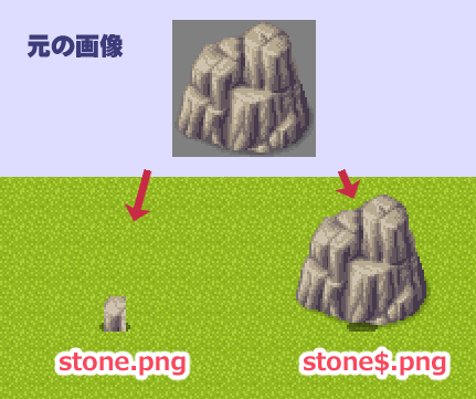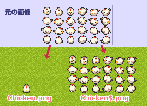 また、「$.png」で終わるキャラチップファイルは画像を分割せず、ゲーム中にその画像まるごと表示します。