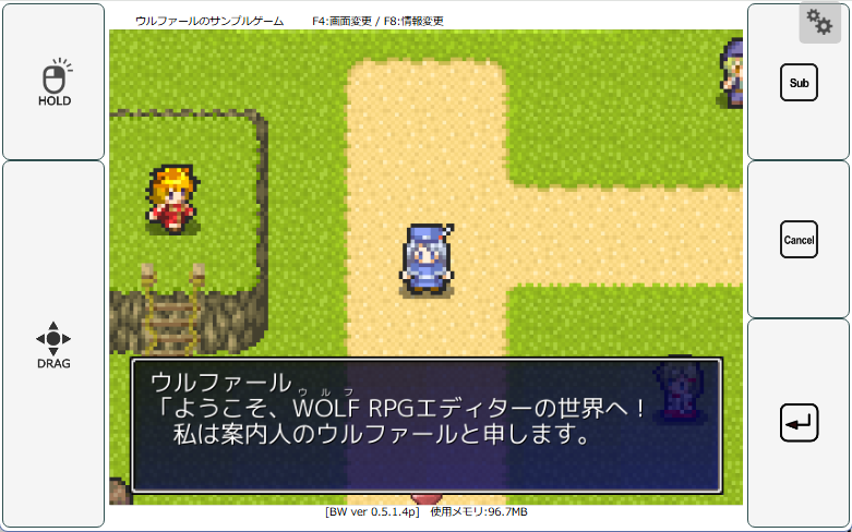 | 【ウディタ作品のブラウザゲーム化ツール 『ブラウザウディタ』】 これはWOLF RPGエディター作品をブラウザゲーム化できるツールです。 これによって、スマートフォンからのプレイも可能になるほか、 いくらかの手順を踏めばスマートフォンアプリ化も実現可能です!(ウディタ作者のアプリ化検証記事) 素晴らしいツールを作ってくださったruka様、誠にありがとうございます! (ただし本体側が新しくなるたびにブラウザウディタも最新化していかねばならない都合上、 本体側のウディタと同様の機能が使えるとは限りませんのでその点はご注意ください。 サポート続けてくださるのも、とても大変ですからね!) ・「ブラウザウディタ開発ページ(Ci-en 日本語)」 https://ci-en.net/creator/12702 (配布/開発ページ) [ブラウザゲーム化する方法](ソフトをダウンロードして解凍した後の操作) 1.ソフトに同梱されている「BrowserWoditor.dat」ファイルを 自作ゲームのBasicDataフォルダ内に入れる。 2.WOLF RPGエディター本体の「ゲームデータ作成」から自作ゲームを「Data.wolf」に暗号化する (フォルダ個別暗号化もできますがData.wolfにするのが一番設定が少なくて簡単です) 3.ファイル内の「public」フォルダ内のData.wolfに上書き (publicフォルダの中に、index.htmlやwoditor.jp、woditor.wasmなど ブラウザ上で動作させるためのプログラムが入っています) 4. 「public」内にある「setting.js」を開いてゲームタイトルなどを設定する 5.「public」フォルダの中味をレンタルサーバーなどにまとめてアップロードする。 レンタルサーバーがなければ、↓で紹介されている「Wodistant」にも ブラウザウディタ作品のテスト機能があります。 6.アップしたURLを開けばゲームがプレイ可能! セーブデータはブラウザのキャッシュに保存されます。 動作見本ページ→ https://rikka-gamedev.itch.io/woditor-in-browser 【起動画面】 ![]() 【ゲーム中画面】 スマートフォンからでもプレイ可能! ![]() |