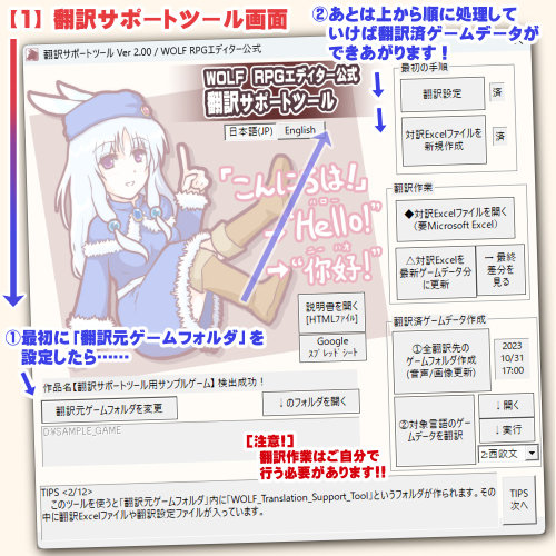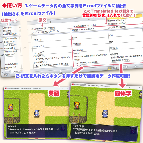 | 【ゲームデータの全文字列抽出や翻訳ができる 『ウディタ翻訳サポートツール』】 これはWOLF RPGエディターゲームデータから全ての文字列をExcelに抽出し、 それに翻訳文を(手動で)書き込んでボタンをいくつか押すだけで 簡単に翻訳済みゲームデータが作成できるというツールです。 翻訳だけでなく、ゲーム内の文字列をまとめて置換するのにも使えます。 これはウディタ公式の有料ソフトです。 ・「WOLF RPGエディター翻訳サポートツール」 販売ページ https://silversecond.booth.pm/items/5151747 (BOOTH) [簡単な使い方] (購入またはダウンロードしていることを前提に) 1. ツールを起動すると以下のような画面が表示されます。 ゲームデータを読み込んだ後、上から順に翻訳処理していくと「翻訳済みゲームデータ」が新たに出力されます。 元のゲームデータは全く変更されませんので安心です。 ![]() 2.ゲームデータから文字列抽出したExcelファイルは以下のようになっています。 これに各言語の訳文を記述して、最後にボタン1つで翻訳済ゲームデータを出力できます。 (なお、Excelをお持ちでなくとも、Googleスプレッドシートでの作業も可能です) ![]() 3.このツールはExcelデータの一番左列の「位置コード」でゲームデータの翻訳箇所を判断していますすが、 もしゲームデータが修正された場合、そのIDも修正が必要です。 ですが、ボタン1つでゲームデータの修正に合わせてExcelのIDを 自動で書き換えてくれる機能があります! 新たに追加された文字列も自動で追加可能! ![]() |