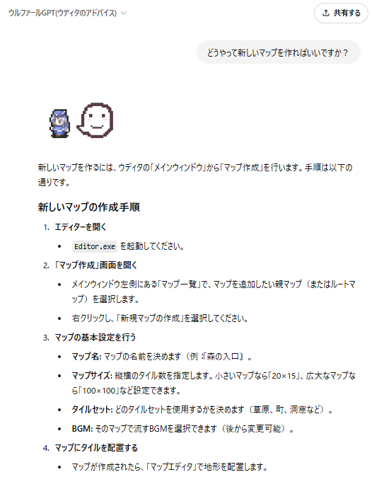 | 【チャット形式でウディタの相談に乗ってくれる 『ウルファールGPT』(ChatGPT)】 これはWOLF RPGエディターの質問に答えてくれるChatGPTのGPTs(専用化AI)です。 このマニュアルの「知識」が搭載されており、質問にそれっぽく答えてくれます。 (※ただし、正しく答えてくれないこともたびたびあります!!) ・「ウルファールGPTページ」 https://chatgpt.com/g/g-sqiNurH0n-uruhuarugpt-uteitanoatohaisu (ChatGPTのアカウントが必要です。Googleアカウントなどで代用可) [使い方] 1.上記URLにアクセスしてください。 アカウントが必要ですが、もし持っていない場合は Googleアカウントなどでもすぐログイン可能です。 2.以下のように、チャット形式でウディタの質問や相談ができます。 【「どうやって新しいマップを作ればいいですか?」と質問した例】 ![]() |