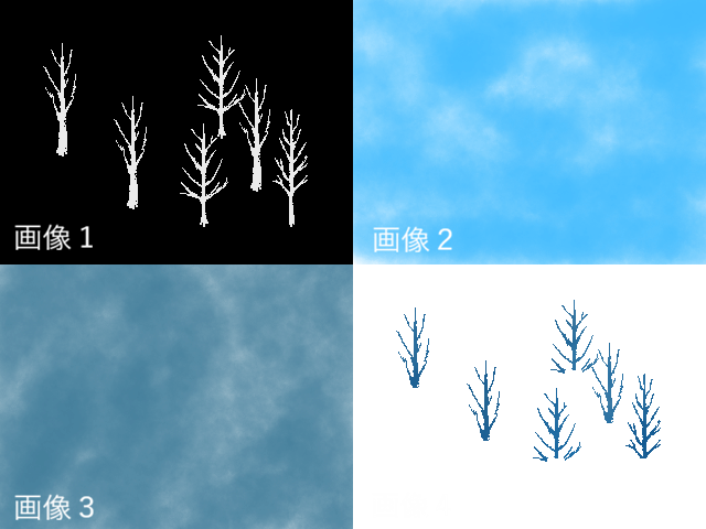 ver2.293とver3.668(Pro版)で比較しました。 画像1を背景に、画像2と画像3をそれぞれ乗算で重ねて、その上に他の画像編集ソフト(GIMPやAffinityPhotoなど)で同じように乗算合成を予め行った画像4を通常モードで重ねてみます。