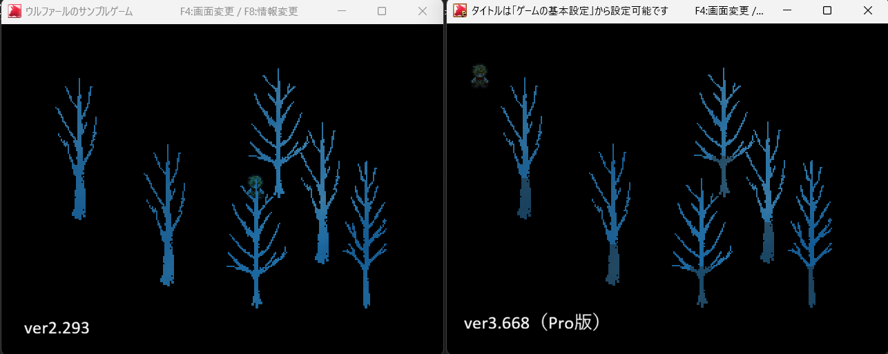 ver2.293では色の境目がほぼ見えません(ウディタと他の画像編集ソフトの乗算合成の結果はほぼ一致しています)。 しかし、ver3.668で同じように重ねたところ、明らかに異なる色合いになってしまいます。