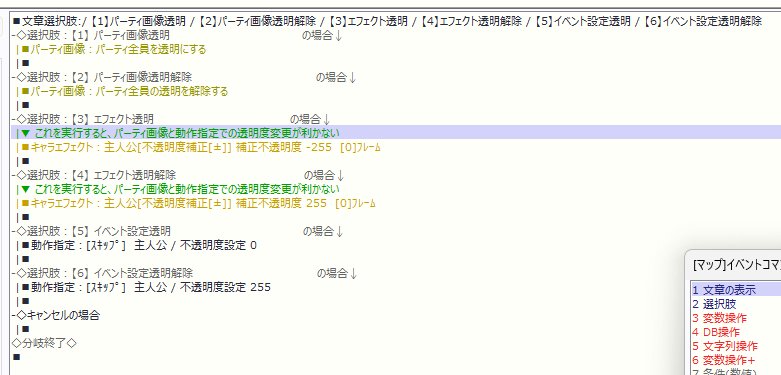 エフェクトコマンドを使わなければ、イベント動作で透明にしたキャラクターをパーティ画像で解除や、その逆も可能です。