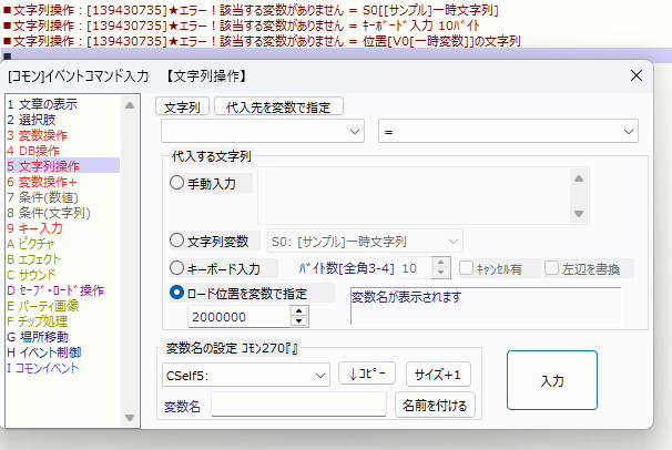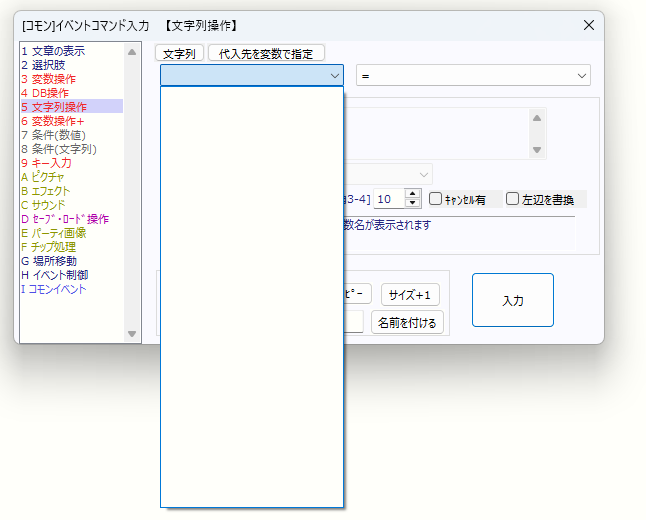 「文字列操作」コマンド入力の代入先の選択と、代入値の選択、両方のボタンでリセットが走るため、一度でも切り替えると手動入力でも、正常なイベンドコードが生成されなくなる